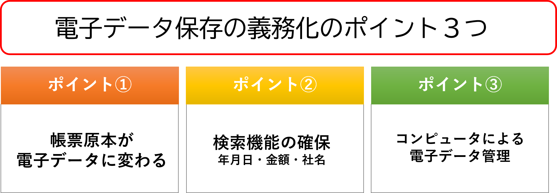 一般的には、パソコンを利用して保存を行い、帳票の「日付」「金額」「社名」などでの検索が必要です。