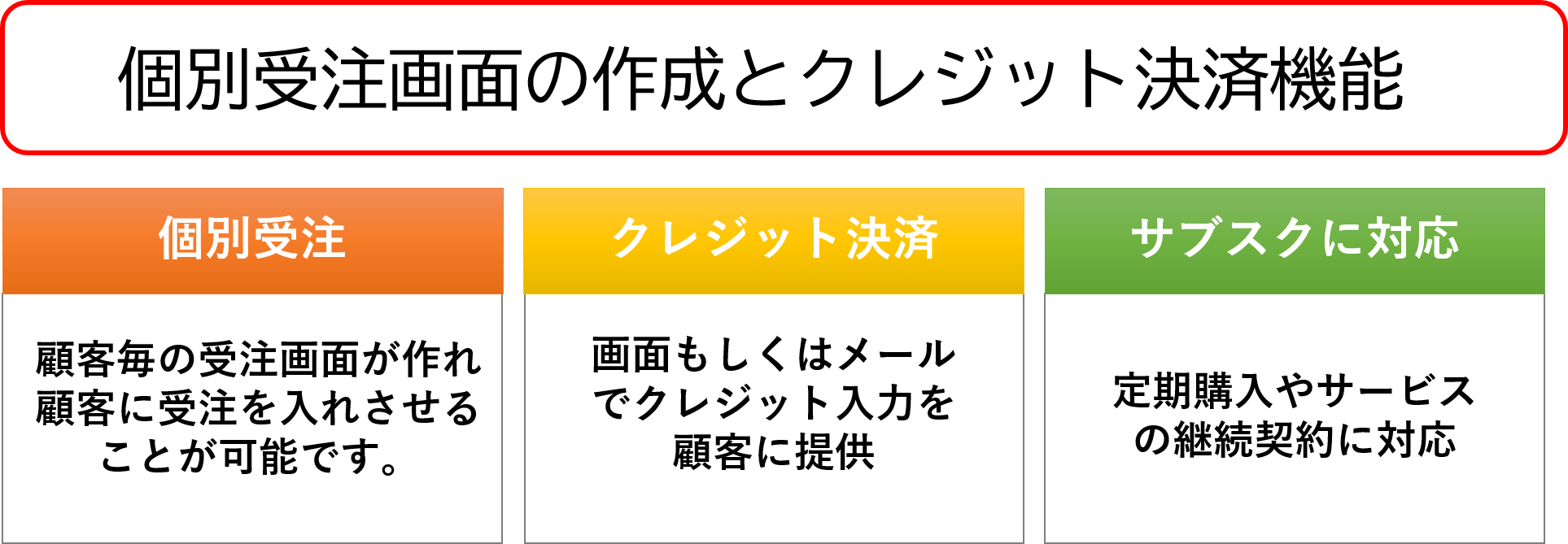 「受注注力」「クレジット決済」「定期決済」(回数、期間などを設定可能)
